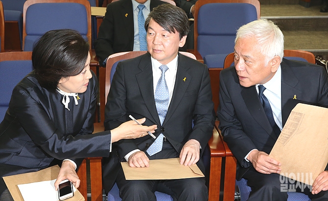 27일 오후, 서울 여의도 국회에서 야당몫 국회부의장 선출을 위한 새정치민주연합 의원총회 도중 박영선 원내대표가 김한길-안철수 공동대표와 이야기를 나누고 있다.