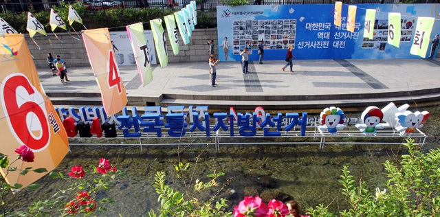 27일 서울 청계천에 6·4 전국동시지방선거 투표참여를 독려하는 홍보물이 설치되어 있다.
