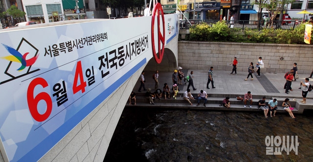 27일 서울 청계천에 6·4 전국동시지방선거 투표참여를 독려하는 홍보물이 설치되어 있다.