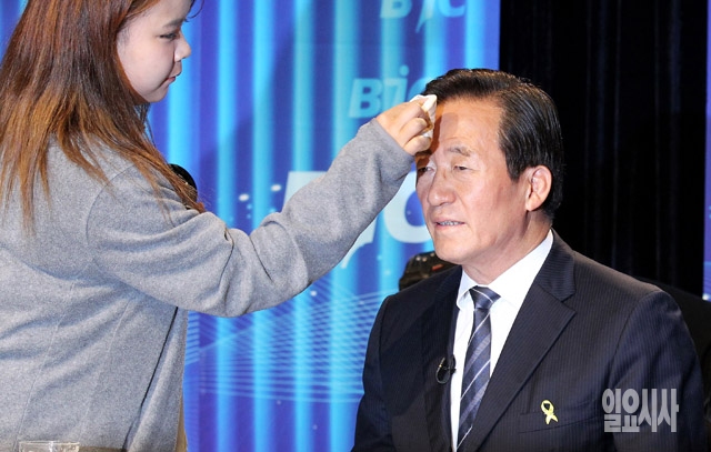 정몽준 새누리당 서울시장 후보가 28일 서울 여의도 63빌딩에서 열린 한국방송기자클럽 초청 토론회에 앞서 메이크업을 점검하고 있다.