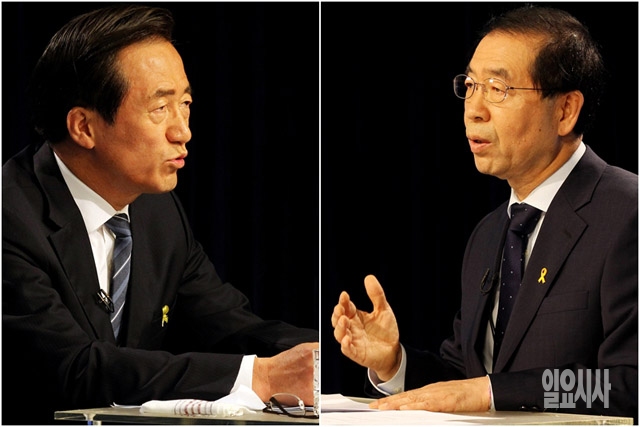 정몽준 새누리당 서울시장 후보(왼쪽)와 박원순 새정치민주연합 서울시장 후보가 28일 서울 여의도 63빌딩에서 한국방송기자클럽 초청 토론회를 갖고 있다.