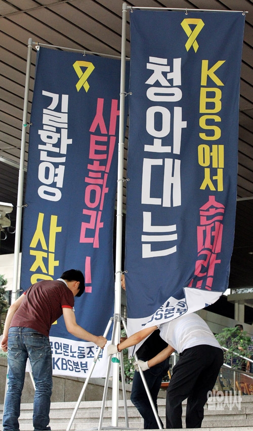길환영 KBS 사장 해임제청안 이사회가 열린 28일 서울 여의도 KBS 신관 앞에서 KBS 조합원들이 길사장의 사퇴를 촉구하는 집회를 갖고 있다.
