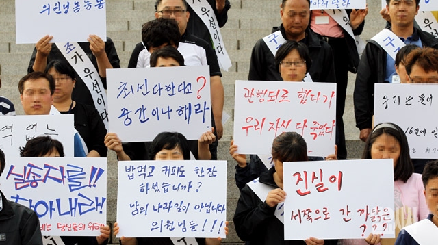 세월호 참사 유가족들이 28일 서울 여의도 국회 본청 앞 계단에서 피켓을 들고 여야를 향해 조속한 국정조사를 요구하고 있다.
