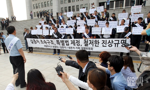 세월호 참사 유가족들이 28일 서울 여의도 국회 본청 앞 계단에서 피켓을 들고 여야를 향해 조속한 국정조사를 요구하고 있다.