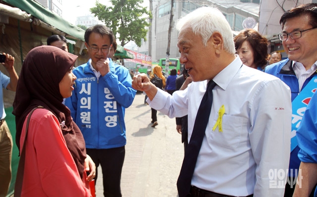 김한길 새정치민주연합 공동대표(오른쪽)가 29일 서울 동대문구 휘경동을 방문, 외국인과 이야기를 나누고 있다.