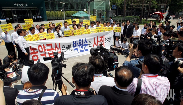 새누리당 정몽준 서울시장 후보를 비롯한 25개 구청장 후보들이 29일 서울시청 정문 앞에서 농약급식 관련 합동기자회견을 갖고 있다.