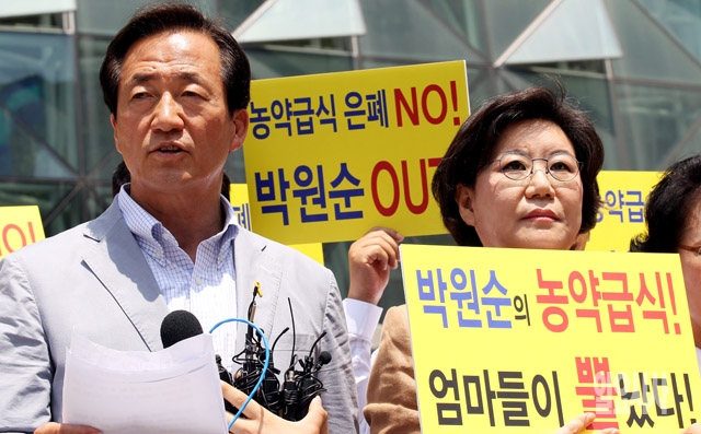 새누리당 정몽준 서울시장 후보를 비롯한 25개 구청장 후보들이 29일 서울시청 정문 앞에서 농약급식 관련 합동기자회견을 갖고 있다.