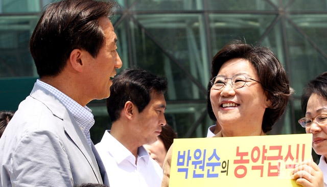 29일 서울시청 정문 앞에서 열린 새누리당 서울시장 후보 및 25개 구청장 후보들의 농약급식 관련 합동기자회견을 마친 정몽준 후보(왼쪽)와 이혜훈 공동선대위원장이 대화를 나누고 있다.