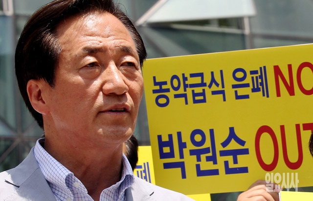 새누리당 정몽준 서울시장 후보를 비롯한 25개 구청장 후보들이 29일 서울시청 정문 앞에서 농약급식 관련 합동기자회견을 갖고 있다.