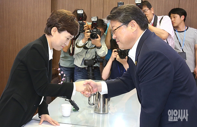 29일 오후, 서울 여의도 국회 의원회관에서 새누리당 조원진 세월호 국조특위 여당 간사(사진 오른쪽)가 증인채택을 포함한 국정조사 계획서 채택 합의를 위한 회동에서 김현미 야당 간사와 악수를 나누며 웃음 짓고 있다.