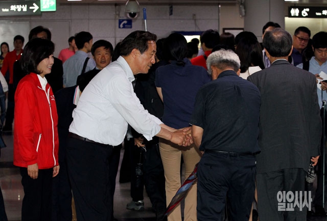 정몽준 새누리당 서울시장 후보가 3일 서울 시청역에서 출근길 시민들에게 인사를 건네며 지지를 호소하고 있다.