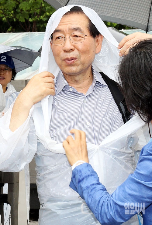 박원순 새정치민주연합 서울시장 후보가 3일 서울 서초구 잠원동에서 우비를 입고 있다.