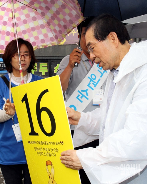 박원순 새정치민주연합 서울시장 후보가 3일 서울 서초구 잠원동을 찾아 세월호 참사 실종자 16명의 귀환을 바라는 피켓을 살펴보고 있다.