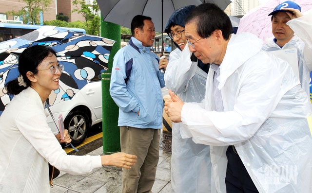 박원순 새정치민주연합 서울시장 후보가 3일 서울 서초구 잠원동을 찾아 시민들에게 인사를 건네며 지지를 호소하고 있다.