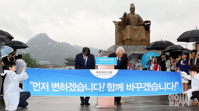 김한길(오른쪽), 안철수 새정치민주연합 공동대표가 3일 서울 광화문광장 세종대왕 동상 앞에서 대국민 호소문 발표에 앞서 인사를 하고 있다.