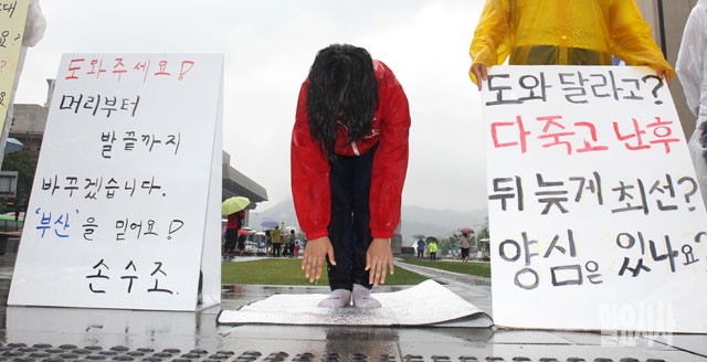 손수조 새누리당 부산 사상 당협위원장이 3일 서울 광화문광장에서 지지호소와 투표독려를 위해 1인 피켓 500배 유세를 하고 있다. 손 위원장 옆으로 새누리당의 유세를 비판하는 시위자가 서 있다.