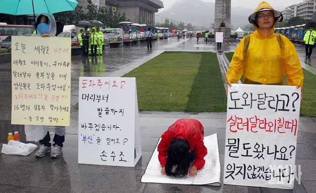 손수조 새누리당 부산 사상 당협위원장이 3일 서울 광화문광장에서 지지호소와 투표독려를 위해 1인 피켓 500배 유세를 하고 있다. 손 위원장 양옆으로 새누리당의 유세를 비판하는 시위자가 서 있다.