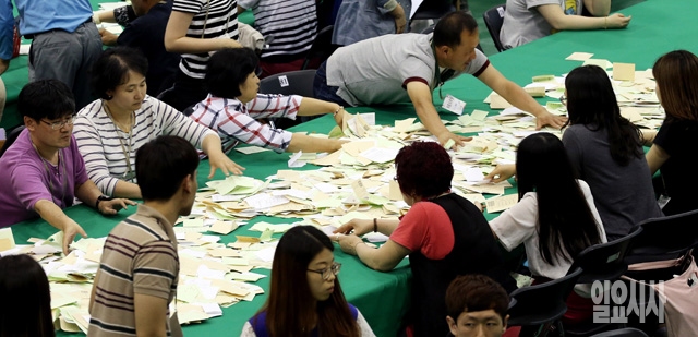 6ㆍ4 전국동시지방선거가 치러진 4일 서울 종로구 경기상업고등학교 체육관에 마련된 개표소에서 개표사무원들이 개표 작업을 하고 있다.