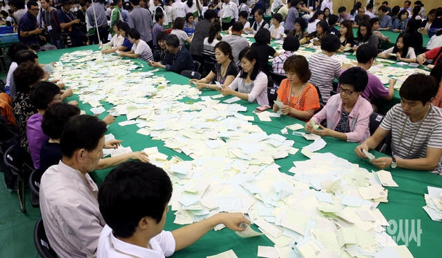 6ㆍ4 전국동시지방선거가 치러진 4일 서울 종로구 경기상업고등학교 체육관에 마련된 개표소에서 개표사무원들이 개표 작업을 하고 있다.