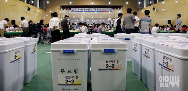 6ㆍ4 전국동시지방선거가 치러진 4일 서울 종로구 경기상업고등학교 체육관에 마련된 개표소에서 개표사무원들이 개표 작업을 하고 있다.
