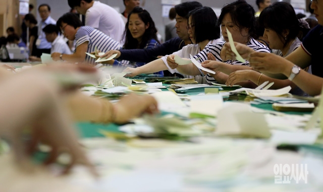 6ㆍ4 전국동시지방선거가 치러진 4일 서울 종로구 경기상업고등학교 체육관에 마련된 개표소에서 개표사무원들이 개표 작업을 하고 있다.