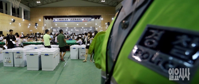 6ㆍ4 전국동시지방선거가 치러진 4일 서울 종로구 경기상업고등학교 체육관에 마련된 개표소에서 개표사무원들이 개표 작업을 하고 있다.