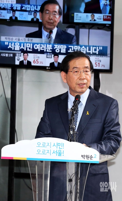 6.4 전국동시지방선거에서 서울시장 후보로 당선이 확실시 된 박원순 새정치민주연합 후보가 5일 오전 서울 종로구 선거캠프에서 기자회견을 갖고 있다.