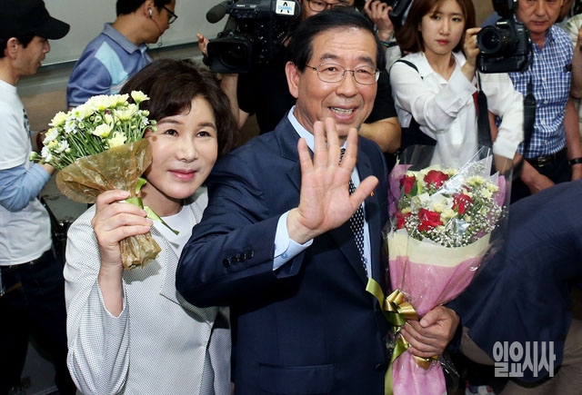 6.4 전국동시지방선거에서 서울시장 후보로 당선이 확실시 된 박원순 새정치민주연합 후보가 5일 오전 서울 종로구 선거캠프에서 부인 강난희 씨와 지지자들을 향해 손을 들어 인사하고 있다.