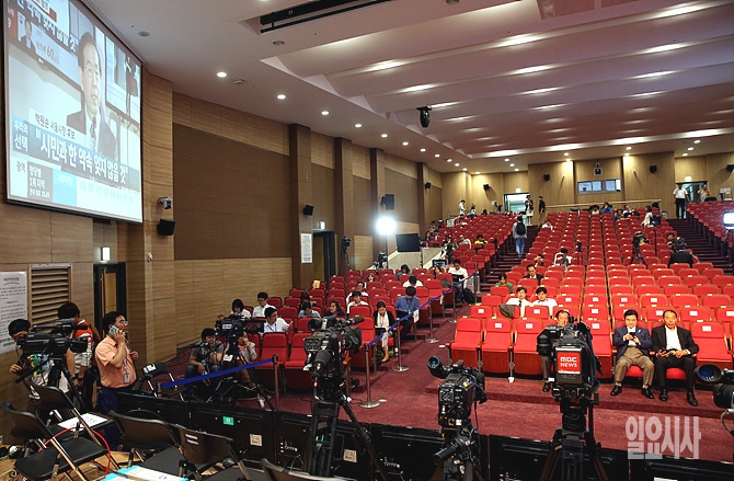 5일 새벽, 서울 여의도 국회 의원회관 대강당 새정치민주연합 선거개표상황실이 차려진 가운데, 경기·인천 등 7곳의 경합지역의 영향으로 당 지도부가 대부분 자리를 비워 텅 비어 있다.