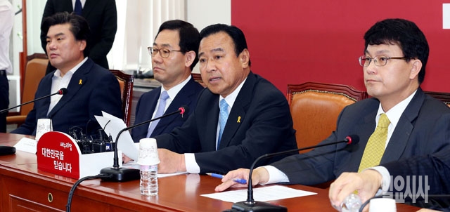 이완구 새누리당 비상대책위원장(오른쪽에서 두번째)이 9일 서울 여의도 국회에서 열린 비상대책위원회의에서 모두발언을 하고 있다.