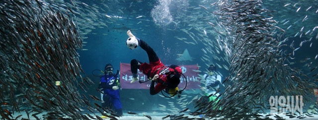 9일 서울 삼성동 코엑스 아쿠아리움에서 다이버들이 대한민국 월드컵 대표팀의 선전을 기원하는 수중 응원 퍼포먼스를 벌이고 있다.