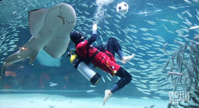 9일 서울 삼성동 코엑스 아쿠아리움에서 다이버들이 대한민국 월드컵 대표팀의 선전을 기원하는 수중 응원 퍼포먼스를 벌이고 있다.