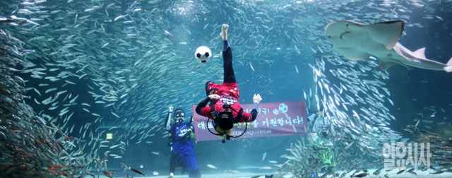 9일 서울 삼성동 코엑스 아쿠아리움에서 다이버들이 대한민국 월드컵 대표팀의 선전을 기원하는 수중 응원 퍼포먼스를 벌이고 있다.