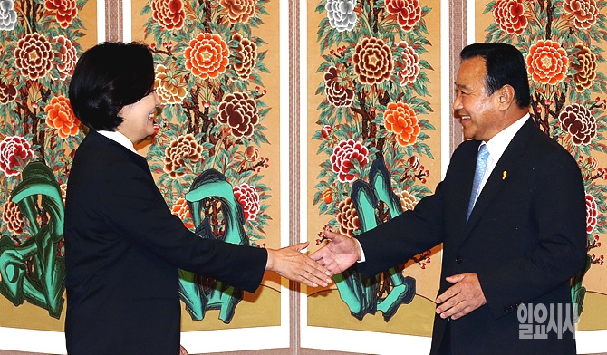 9일 오전, 새누리당 이완구·새정치민주연합 박영선 원내대표가 서울 여의도 국회 사랑재에서 원내대표 회담 직전, 악수를 나누고 있다.