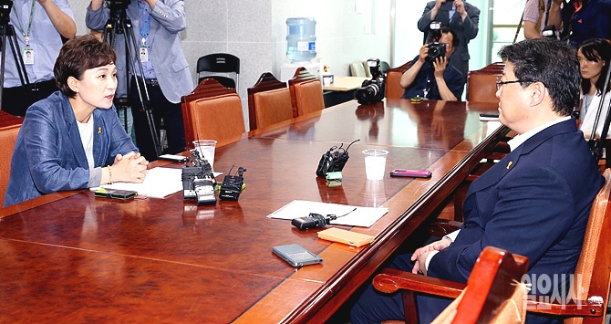 9일 오후, 서울 여의도 국회의원회관 회의실에서 세월호 국조특위 조원진(사진 오른쪽) 새누리당 간사와 김현미 새정치민주연합 간사가 기관조사 등 일정 협의를 위해 논의하고 있다.