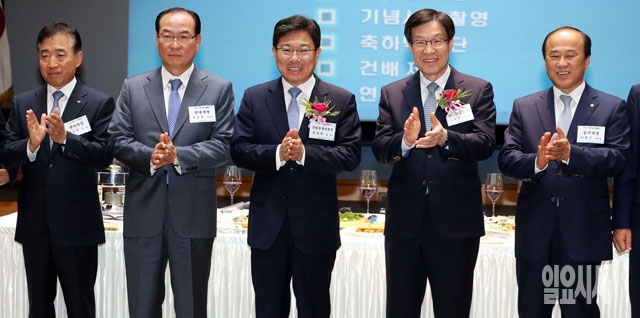 9일 서울 포스코센터에서 열린 제 15회 철의 날 기념행사에서 윤상직 산업통상자원부 장관(왼쪽에서 세번째), 권오준 철강협회 회장(네번째)을 비롯한 참석자들이 박수를 치고 있다.