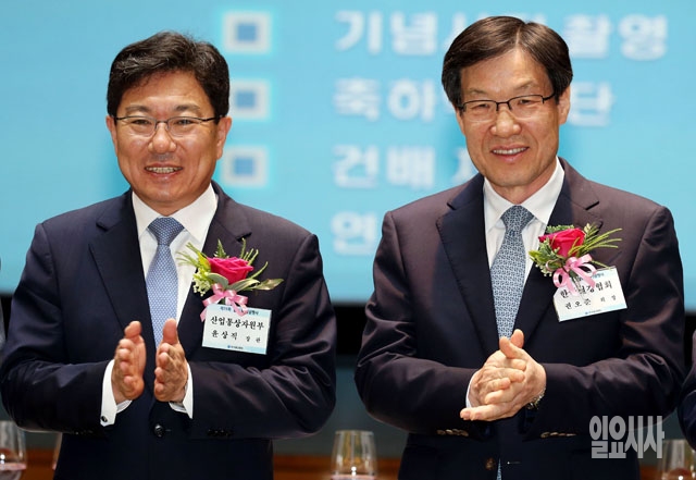 9일 서울 포스코센터에서 열린 제 15회 철의 날 기념행사에서 윤상직 산업통상자원부 장관(왼쪽), 권오준 철강협회 회장이 박수를 치고 있다.