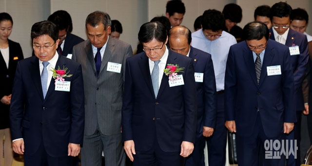 9일 서울 포스코센터에서 열린 제 15회 철의 날 기념행사에서 윤상직 산업통상자원부 장관, 권오준 철강협회 회장을 비롯한 참석자들이 세월호 희생자에 대한 묵념을 하고 있다.