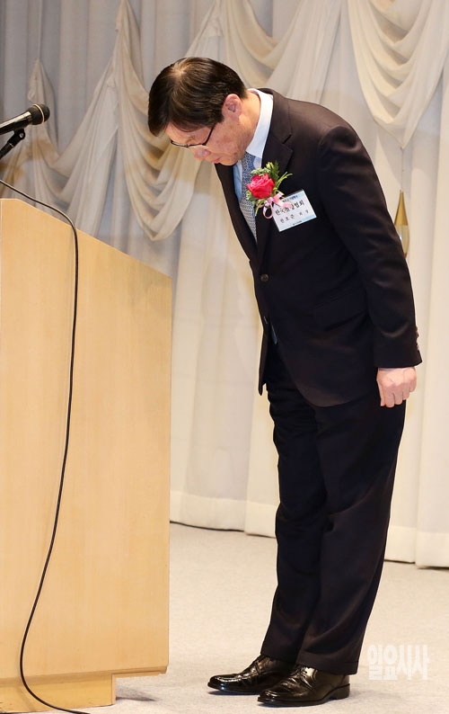 권오준 철강협회 회장이 9일 서울 포스코센터에서 열린 제 15회 철의 날 기념행사에서 기념사를 마친 뒤 인사하고 있다.
