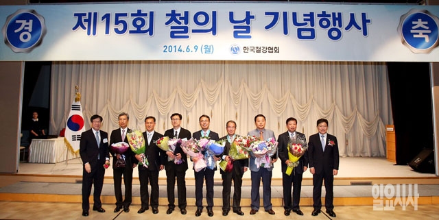 9일 서울 포스코센터에서 열린 제 15회 철의 날 기념행사에서 윤상직 산업통상자원부 장관, 권오준 철강협회 회장을 비롯한 유공자 포상자들이 기념촬영을 하고 있다.