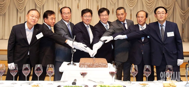 9일 서울 포스코센터에서 열린 제 15회 철의 날 기념행사에서 윤상직 산업통상자원부 장관(왼쪽에서 네번째), 권오준 철강협회 회장(다섯번째)을 비롯한 참석자들이 축하떡을 자르고 있다. 사진 왼쪽부터 손봉락 TCC동양 회장, 이순형 세아제강 회장, 박승하 현대제철 부회장, 윤 장관, 권 회장, 장세주 동국제강 회장, 이종근 동부제철 부회장, 오일환 한국철강 부회장.