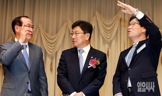 9일 서울 포스코센터에서 열린 제 15회 철의 날 기념행사에서 박승하 현대제철 부회장(왼쪽부터), 윤상직 산업통상자원부 장관, 권오준 철강협회 회장이 대화를 나누고 있다.