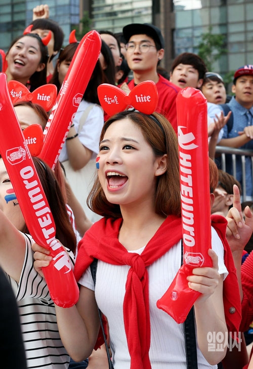 2014 브라질 월드컵 조별리그 H조 대한민국과 러시아의 경기가 열린 18일 서울 광화문광장에 모인 붉은악마 및 시민들이 경기를 보며 응원을 펼치고 있다.