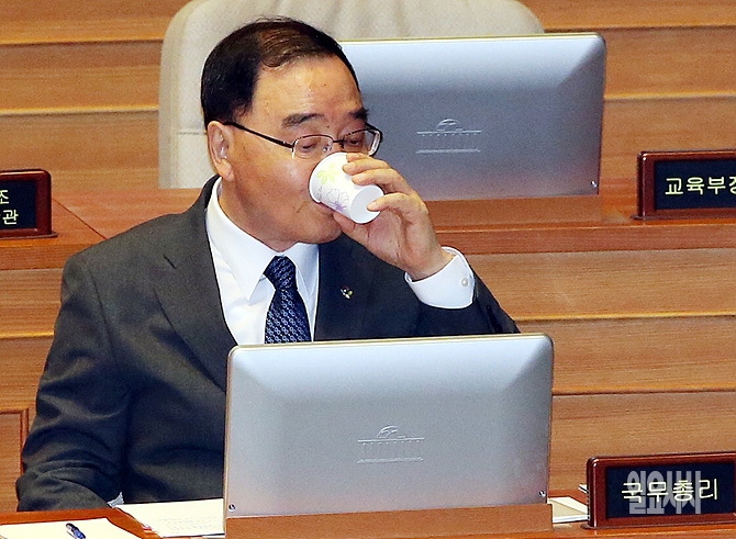 18일, 서울 여의도 국회에서 열린 외교·안보 부문 국회 대정부 질문에서 정홍원 국무총리가 대기 중에 목이 타는 듯 물을 들이키고 있다.