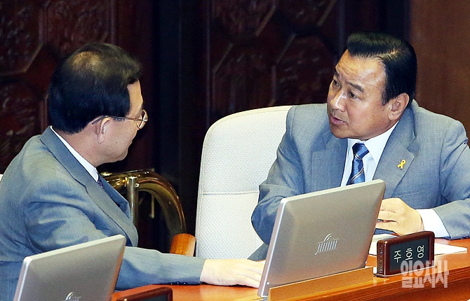 18일, 서울 여의도 국회에서 열린 외교·안보 부문 국회 대정부 질문 전, 이완구 새누리당 원내대표와 주호영 정책위의장이 이야기를 나누고 있다.