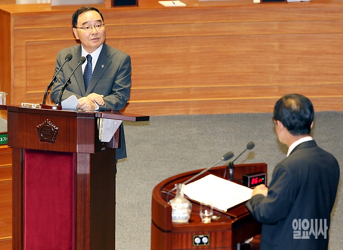 18일, 서울 여의도 국회에서 열린 외교·안보 부문 국회 대정부 질문에서 정홍원 국무총리가 새정치민주연합 원혜영 의원의 질문에 답변하고 있다.