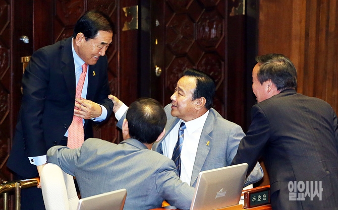 18일, 서울 여의도 국회 본회의장에서 열린 외교·안보 부문 국회 대정부 질문에 앞서 새누리당 이완구 원내대표-이재오-김재원 의원 등이 이야기를 주고 받으며 웃고 있다.
