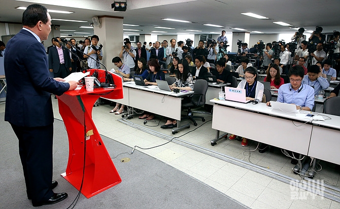19일, 서울 여의도 새누리당 당사에서 서청원 의원이 기자회견을 갖고 당 대표를 선출하는 7·14전당대회 출마를 공식선언하고 있다.