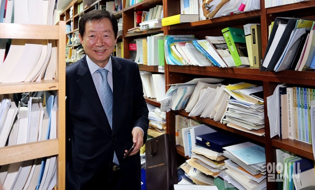 서울대학교 차기 총장 최종후보로 선출된 성낙인 법학전문대학원 교수가 19일 서울대학교 자신의 교수실에서 밝게 웃고 있다.