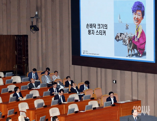 20일 서울 여의도 국회에서 열린 본회의에서 유승희 새정치민주연합 의원이 교육ㆍ사회ㆍ문화 분야 대정부질문을 하는 도중 박근혜 대통령의 풍자 스티커를 화면에 띄우고 있다.